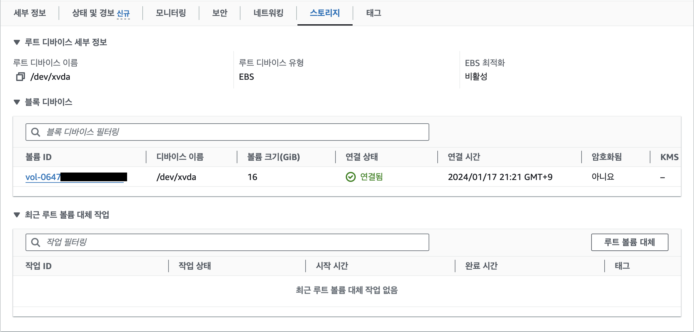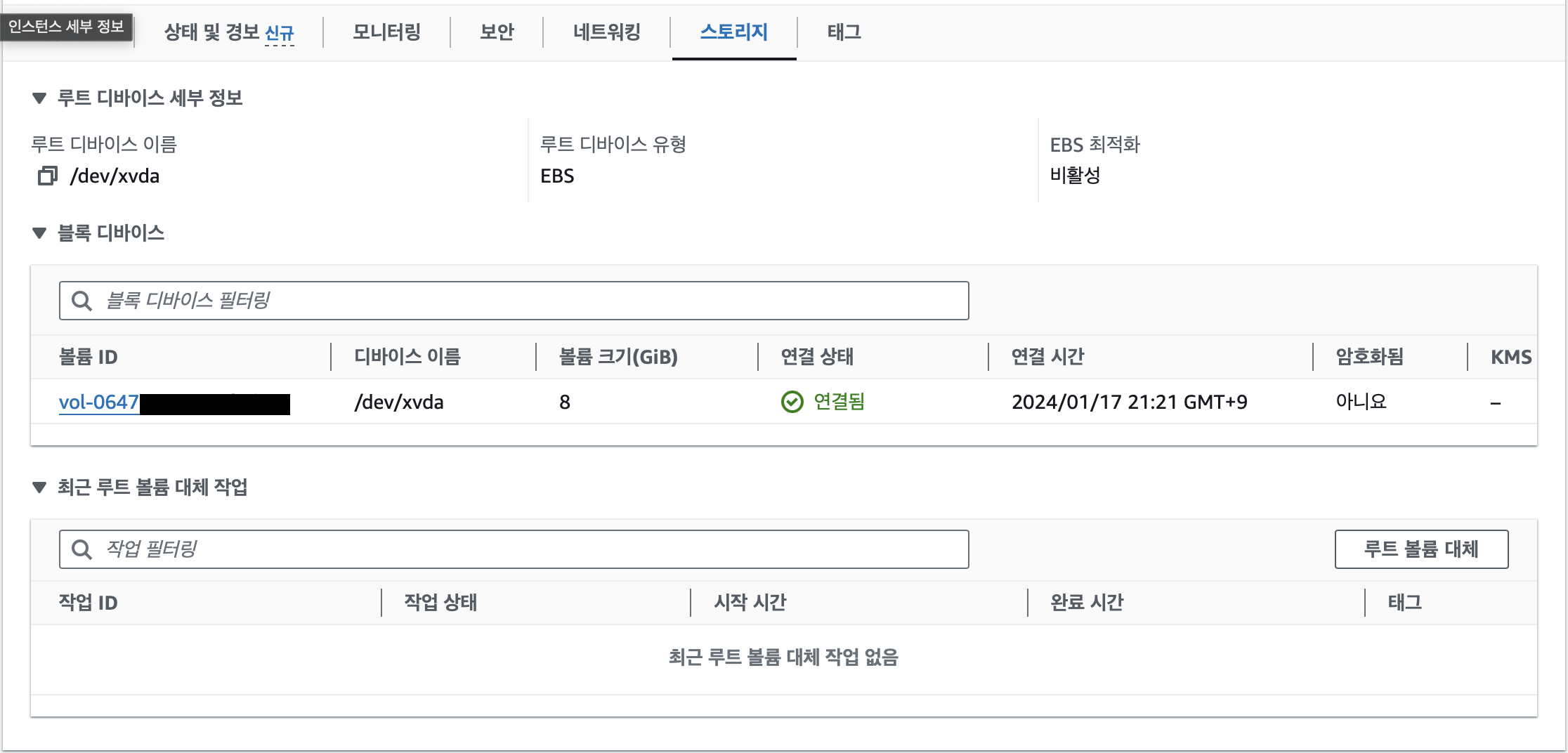 인스턴스 요약에서 스토리지로 들어가줍니다. 볼륨 크기가 8GiB인 것을 확인하고 볼륨 ID를 눌러 들어가줍니다.