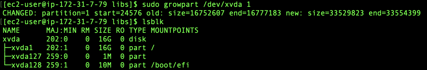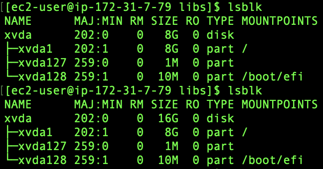 위 명령어를 통해 /dev/xvda가 8G에서 16G로 크기가 늘어난걸 확인할 수 있습니다.
