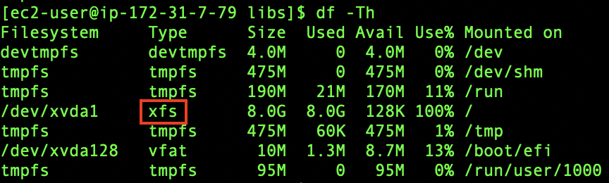 df -Th 명령어를 통해 /dev/xvda1의 타입을 알 수 있습니다. xfs의 경우 xfs_growfs 명령어를, ext4의 경우 resize2fs 명령어를 사용하여 파일 시스템에 적용시켜줍니다.