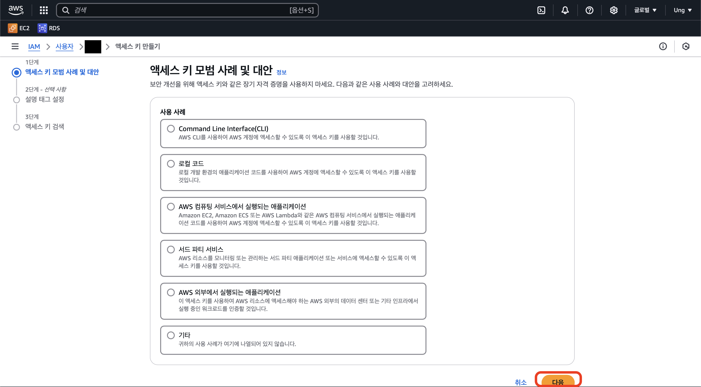 7. IAM -> 사용자 -> 이름 클릭 -> 보안 자격 증명 -> 액세스 키 만들기