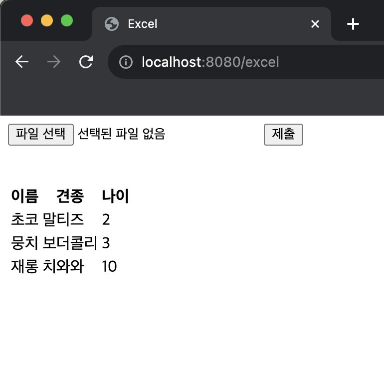 강아지의 이름, 견종, 나이가 포함된 엑셀 파일을 읽어와 DB에 저장 후 확인을 위해 화면에 출력