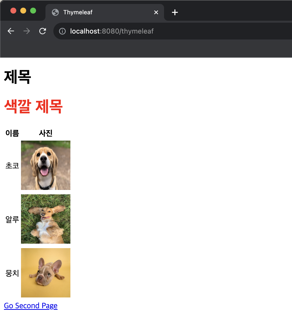 위와 같이 사용하여 http://localhost:8080/thymeleaf/second 링크로 이동할 수 있습니다.